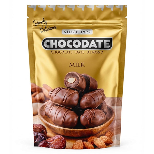Dattes enrobées de chocolat au lait amande – Marque Chocodate – 90g